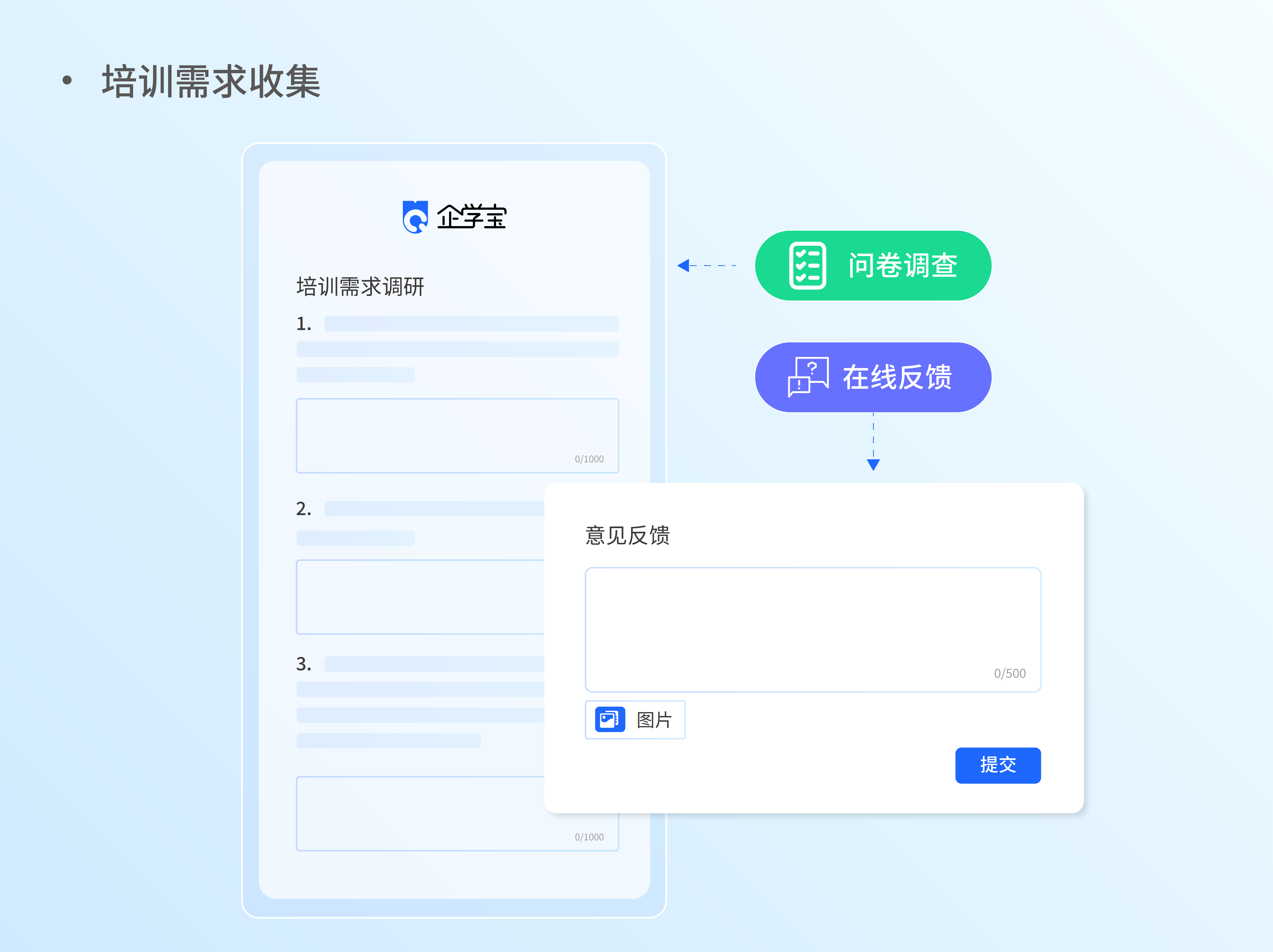 平台与企业微信等主流 OA 系统无缝对接,员工点击即可进入企学宝学习平台,无需重复注册登录;组织架构与员工信息自动同步,问卷调查、意见反馈等需求收集环节全面线上化,省去人工录入的繁琐流程,实现培训场景与办公场景深度融合。