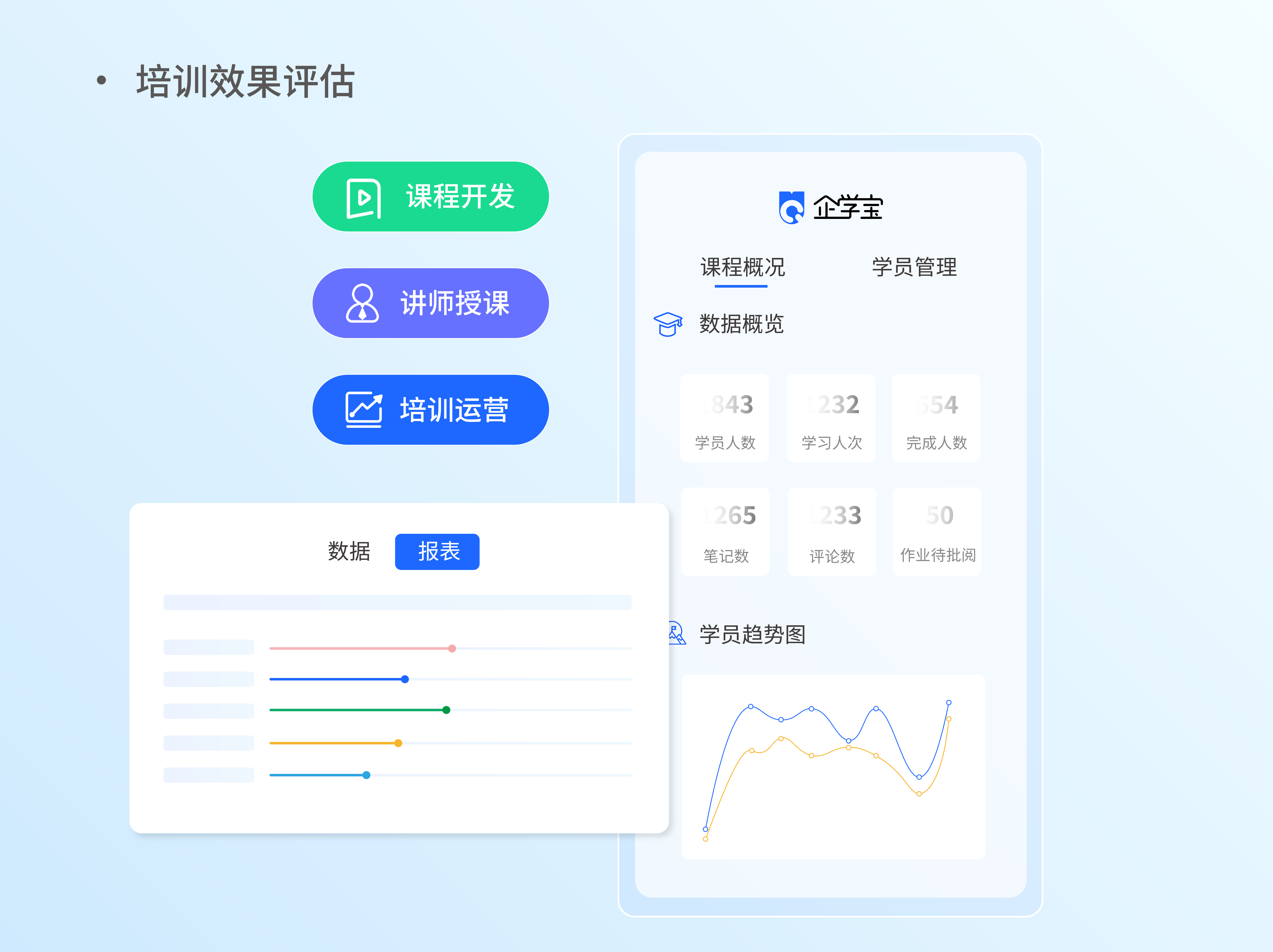 4、多维度培训评估: 不仅要实现基本的考试评估,还需追踪学习行为、关联绩效数据,构建更完善的培训效果评估体系。