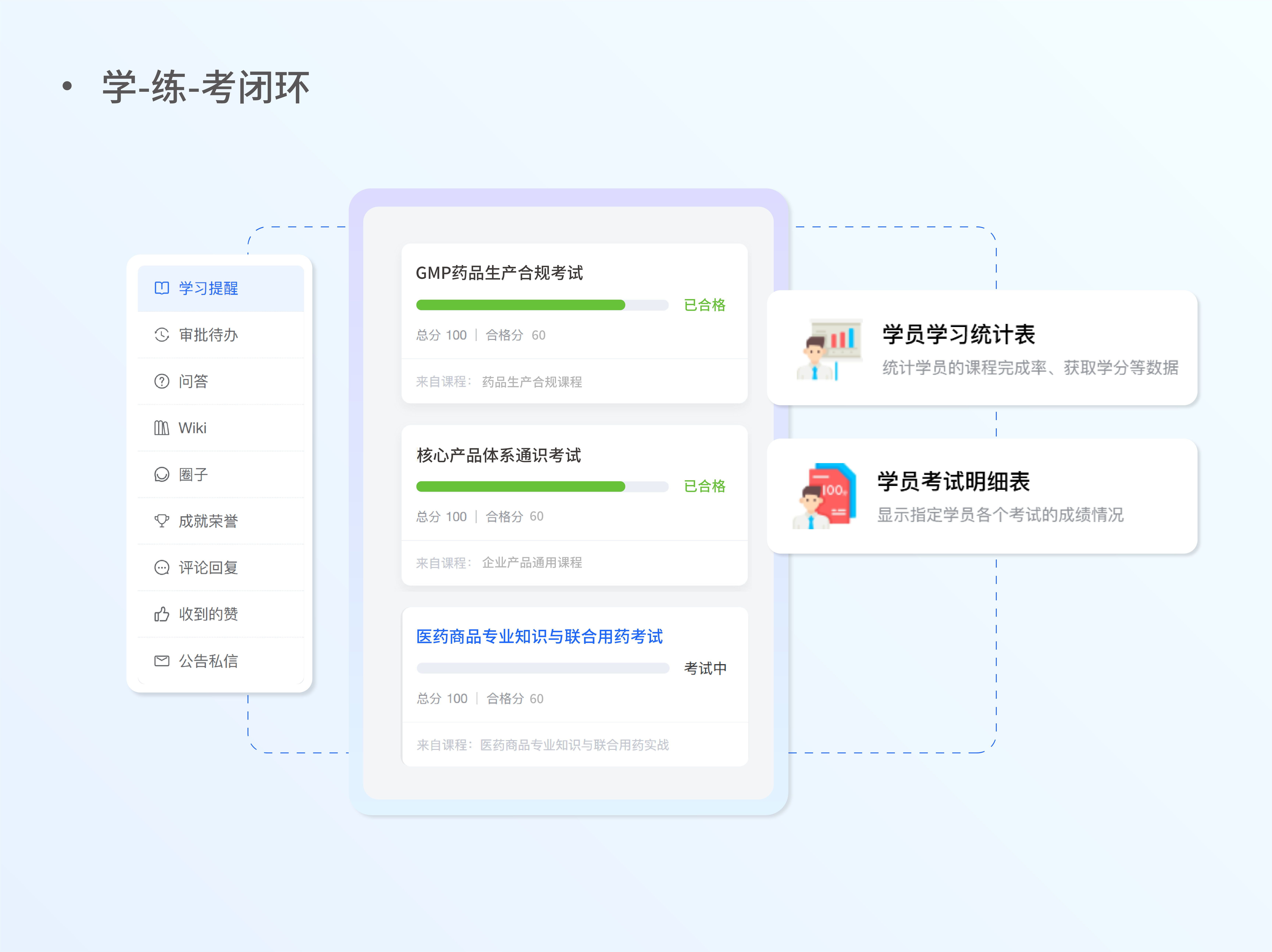 系统可自动跟踪并提醒员工完成GMP、GLP等强制性合规培训,并记录学习轨迹;线上周期性安排考试与认证,确保关键岗位员工具备必要的资质与能力。管理后台的智能报表生成多维度的可视化数据,为培训优化提供合理支持。