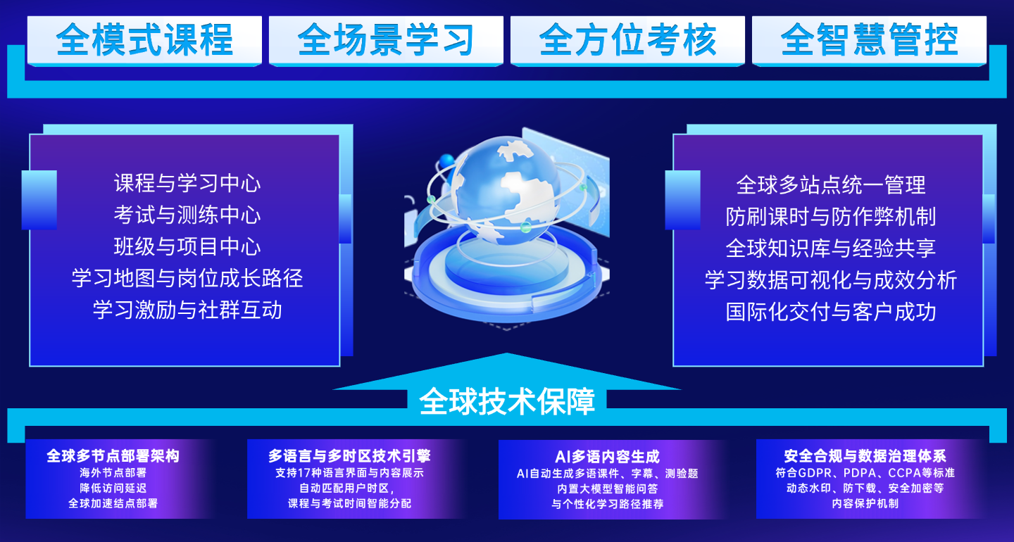 基于“技术赋能全球人才成长”的理念,企学宝国际版V2.0融合AI与大数据的核心能力,打造“产品四核+技术四力”双驱融合的数智化培训解决方案,全面覆盖全球部署、多语适配、合规安全与智能学习全流程。