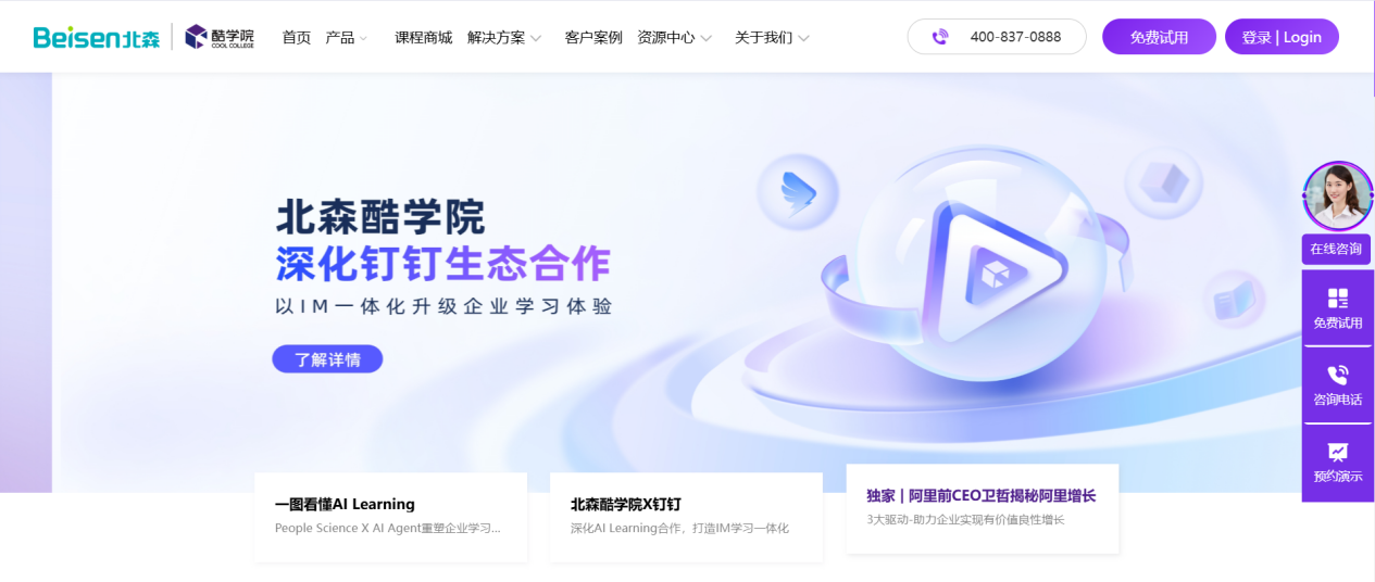 功能特色:(1)以AI 智能体驱动人才管理闭环,能够实现AI教练实时指导、人才盘点、岗位能力模型构建、线上学习计划定制等;(2)丰富通识课程资源与企业专属私域知识资产整合,实现内外部资源融合,为企业提供完整的内容生态体系;(3)支持直播、录播、小组讨论、案例分析等多种教学形式,并提供模块化功能组合,兼顾灵活与专业;(4)培训与人才数据联动分析,支撑企业人才梯队建设。