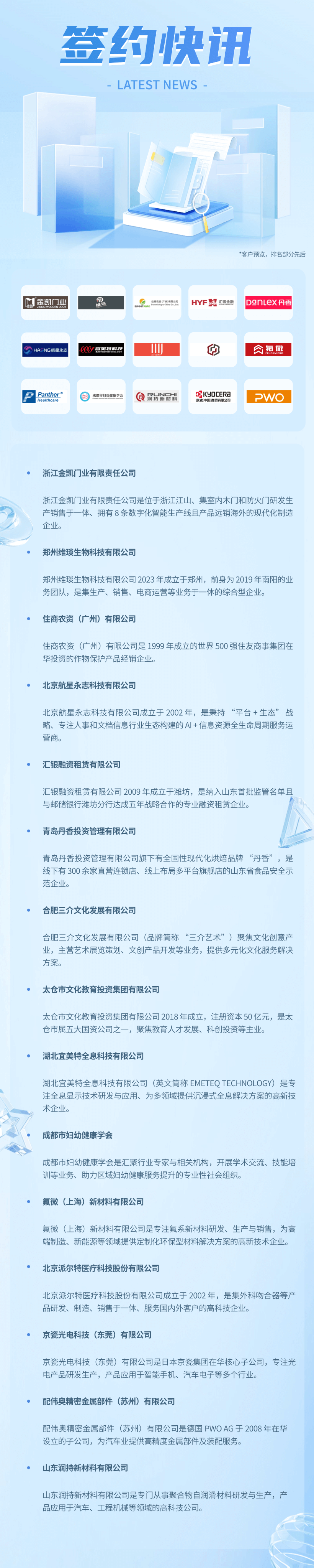 深耕企业培训领域十数载,企学宝始终秉持助力企业迈向数字化未来的使命,持续精进平台功能、优化智能学习体验。近期,企学宝荣幸宣布与浙江金凯门业有限责任公司、郑州维琰生物科技有限公司、住商农资(广州)有限公司、北京航星永志科技有限公司、汇银融资租赁有限公司、青岛丹香投资管理有限公司、合肥三介文化发展有限公司、太仓市文化教育投资集团有限公司、湖北宜美特全息科技有限公司、成都市妇幼健康学会、氟微(上海)新材料有限公司、北京派尔特医疗科技股份有限公司、京瓷光电科技(东莞)有限公司、配伟奥精密金属部件(苏州)有限公司、山东润持新材料有限公司等多领域企业达成深度合作,携手共启数智化培训新篇章。