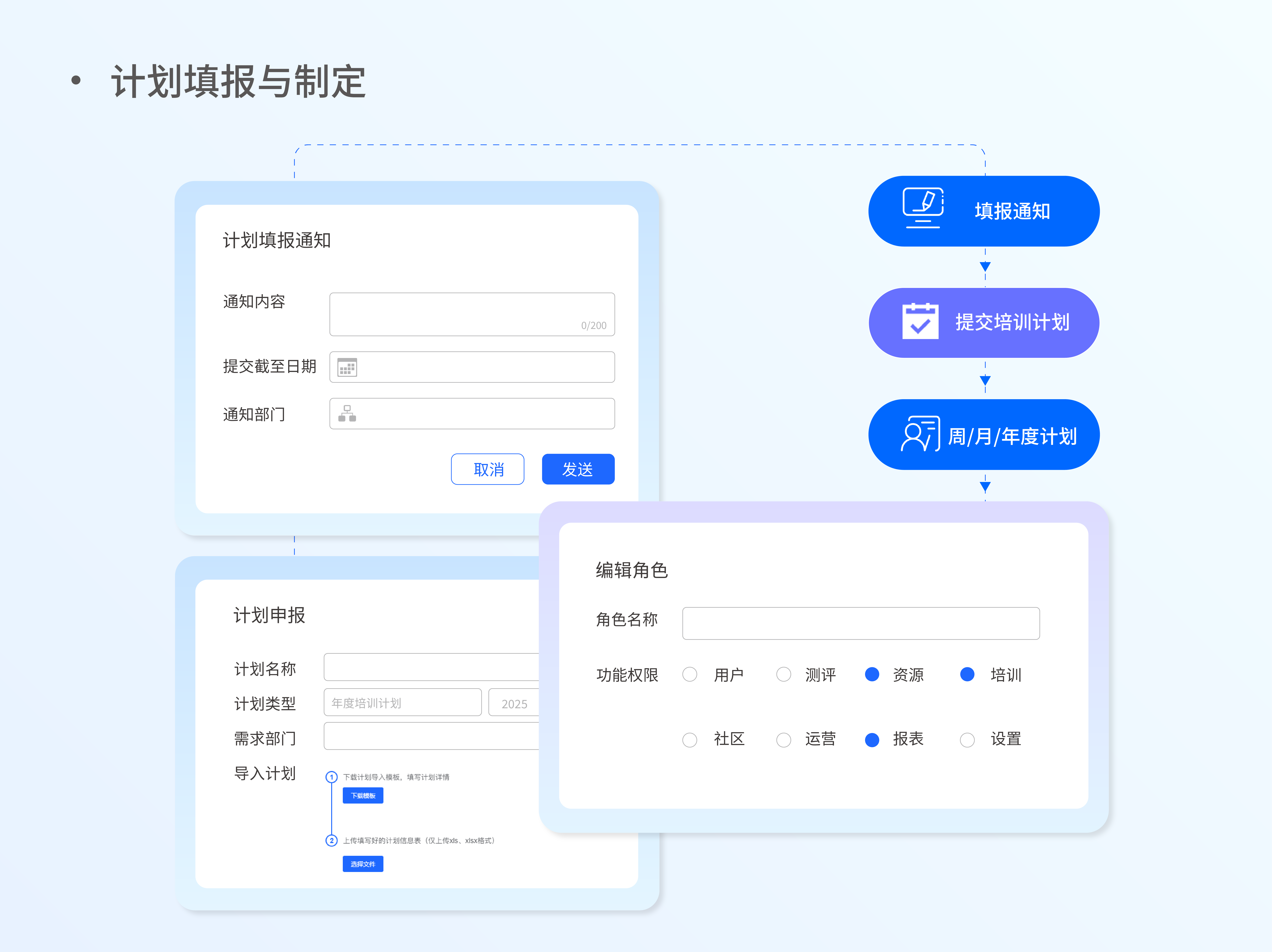 智能通知下发:总管理员可一键发送计划填报通知,精准设定提交部门与截止时间,系统自动提醒相关部门培训管理员;