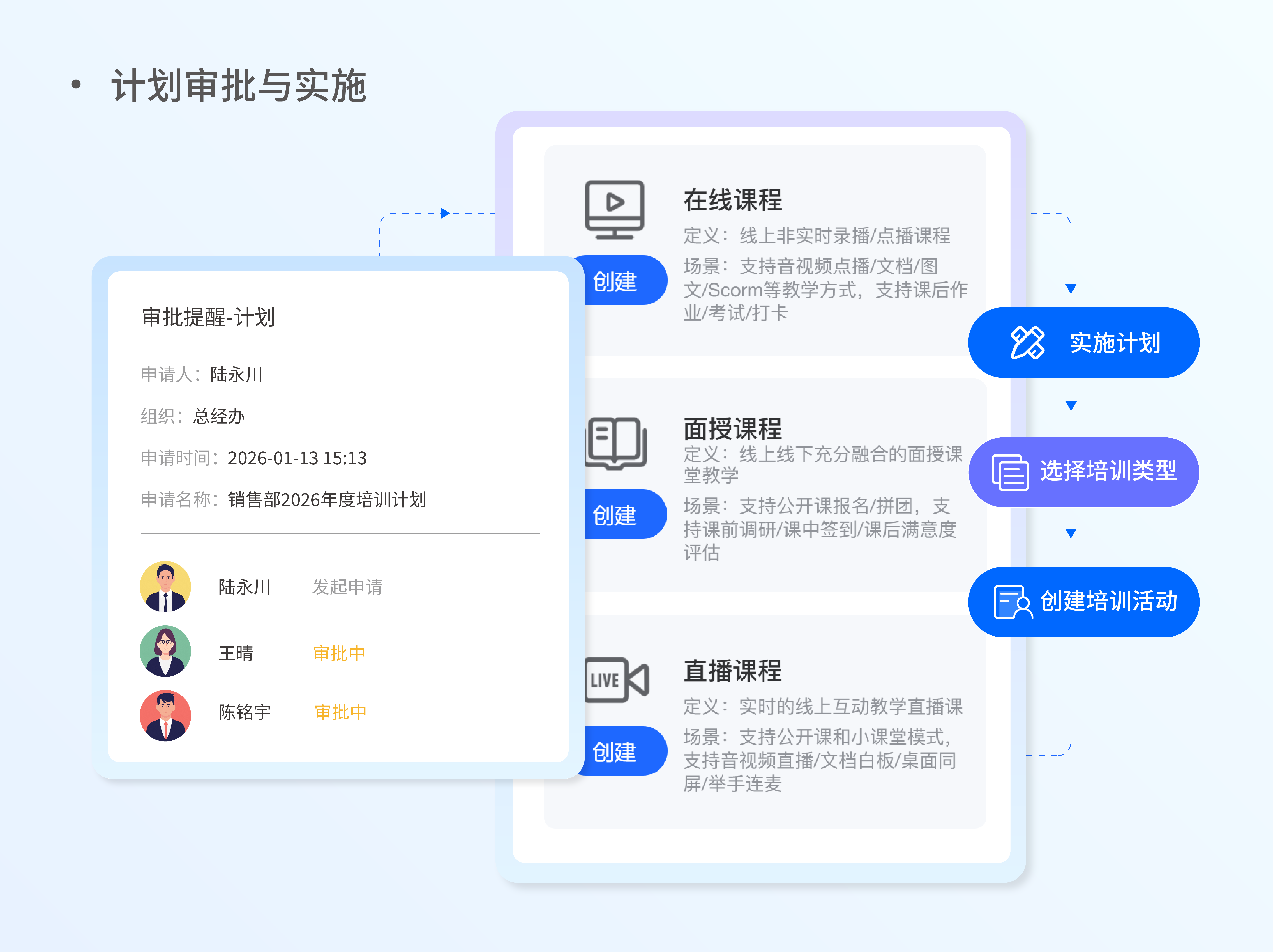 灵活实施方式:管理员可根据计划创建新的培训活动,或关联系统已有课程/班级,支持面授、线上、OMO混合等多种培训形式。