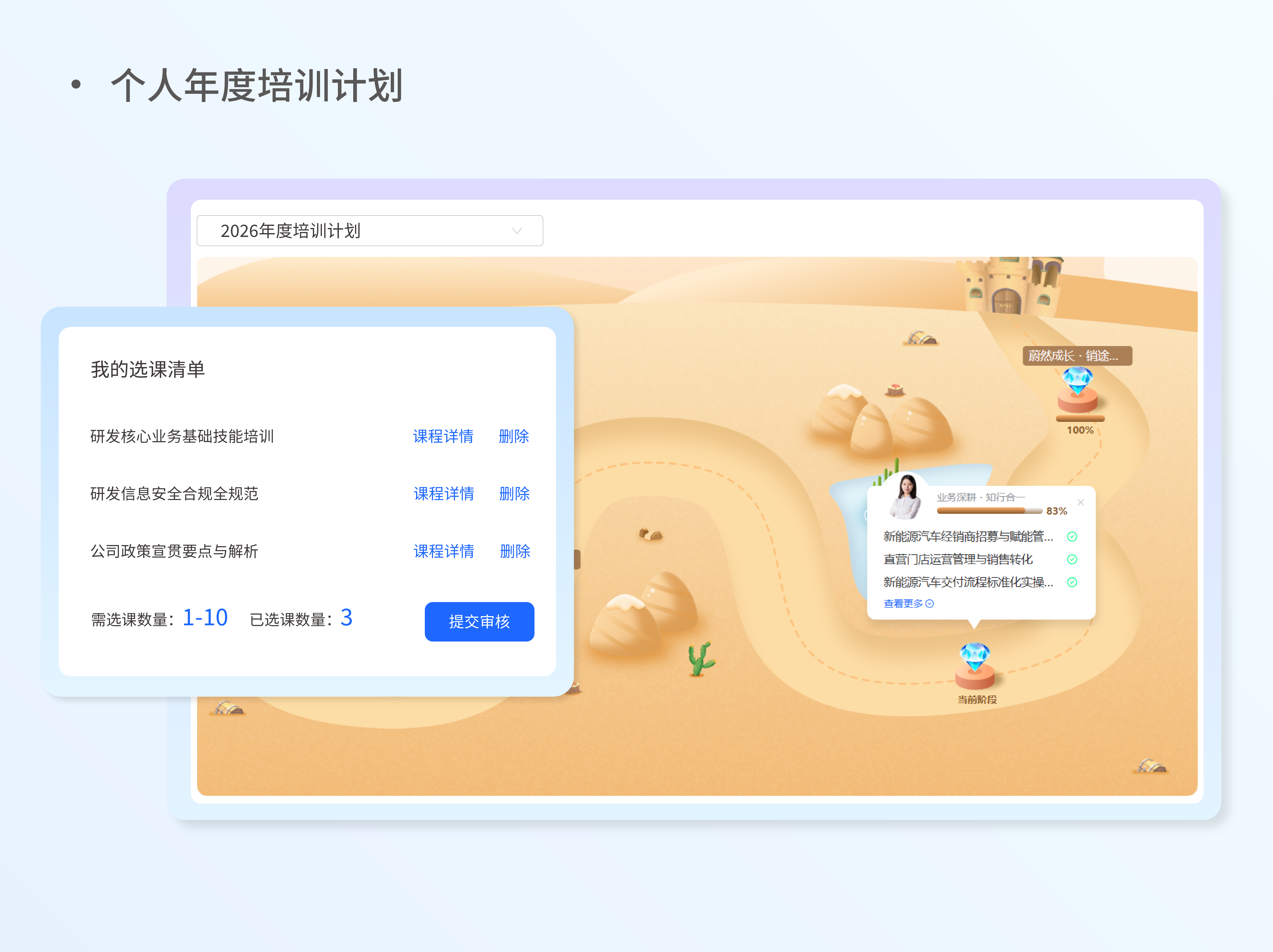 游戏化学习地图:员工选课审核通过后,系统自动生成个人年度培训计划,并以游戏化学习地图的方式展示,提升学习趣味性。