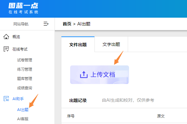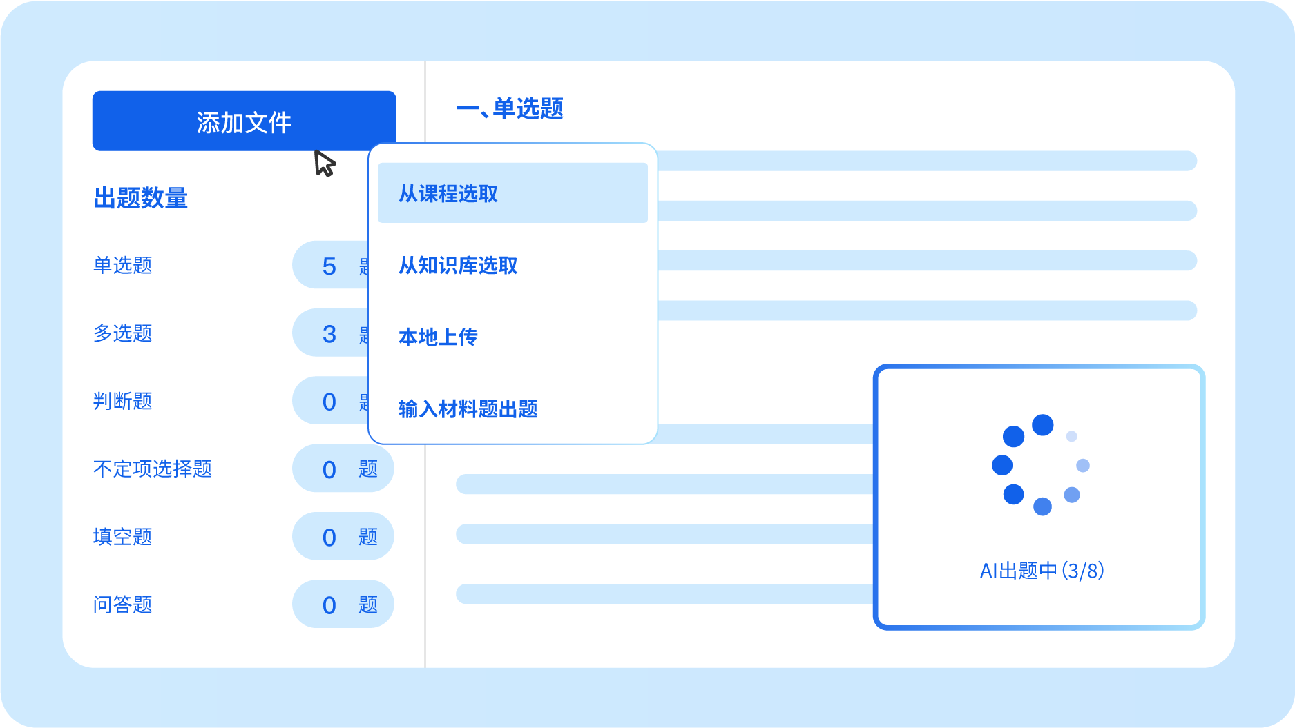 核心能力:基于自研大模型,支持上传文档或输入关键词/知识点出题,可生成单选、多选、判断、填空、简答等全题型试题。操作简便,上传材料后三步即可完成生成、审核与发布。