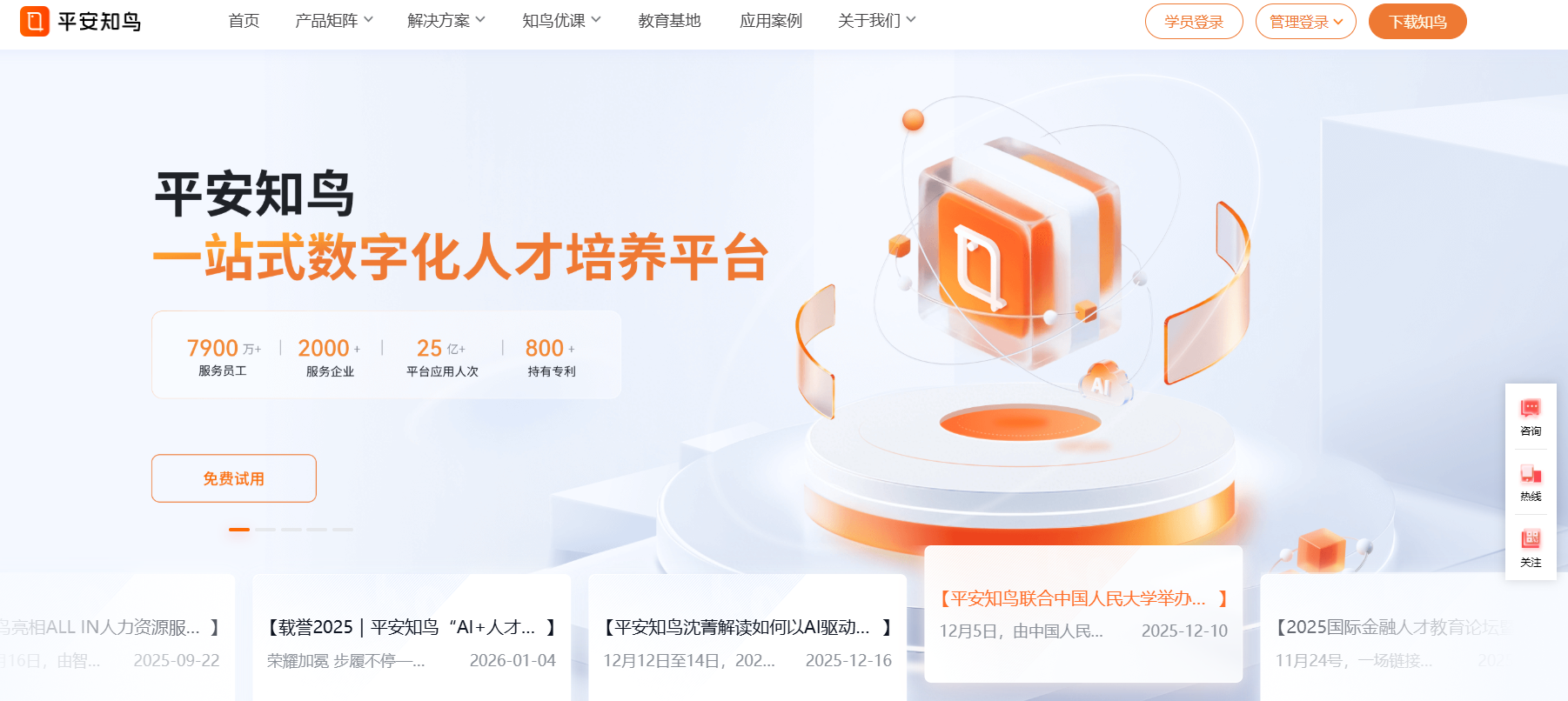 核心特色功能:平安知鸟依托平安集团37年培训经验,提供咨询+平台+内容+运营一站式服务。核心产品包括AI陪练、AI导师、AI做课、AI考试、AI运营,学、练、考等全场景覆盖,并具备党建培训、金融销售赋能等垂直解决方案。