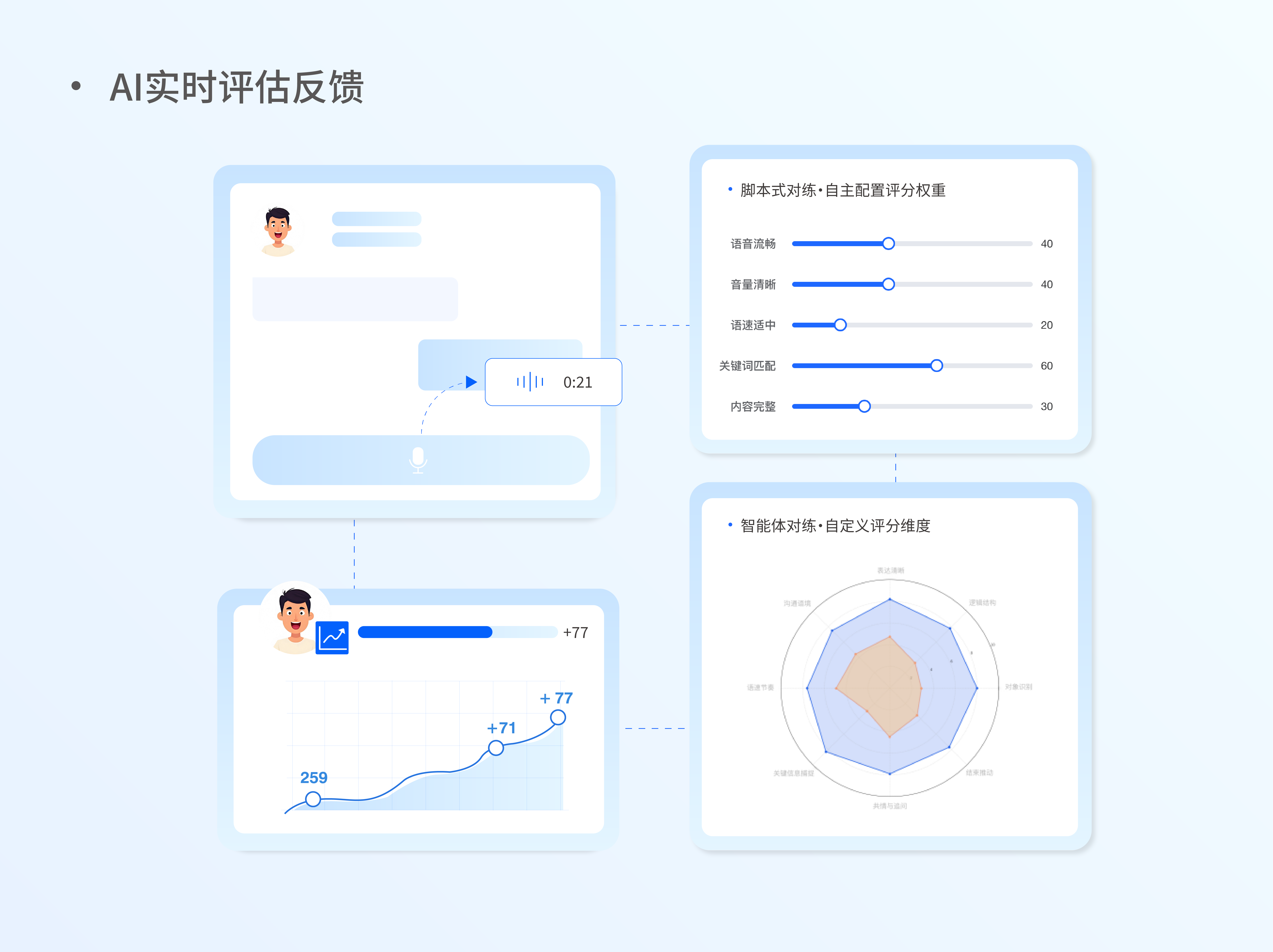 系统提供多维度的能力评估与数据看板,AI从清晰度、逻辑、完整性、共情与追问等多维度,为每一次练习生成专业量化评分与针对性优化建议,让管理者清晰掌握团队训练投入度,也让业务人员直观追踪个人能力成长全轨迹。脚本式对练支持调节各评分维度的权重,智能体对练则支持评分维度按需灵活配置,企业可根据自身业务特性与培训重点自定义调整,保障评估数据呈现合理性,让训练成效评估更贴合企业实际需求。