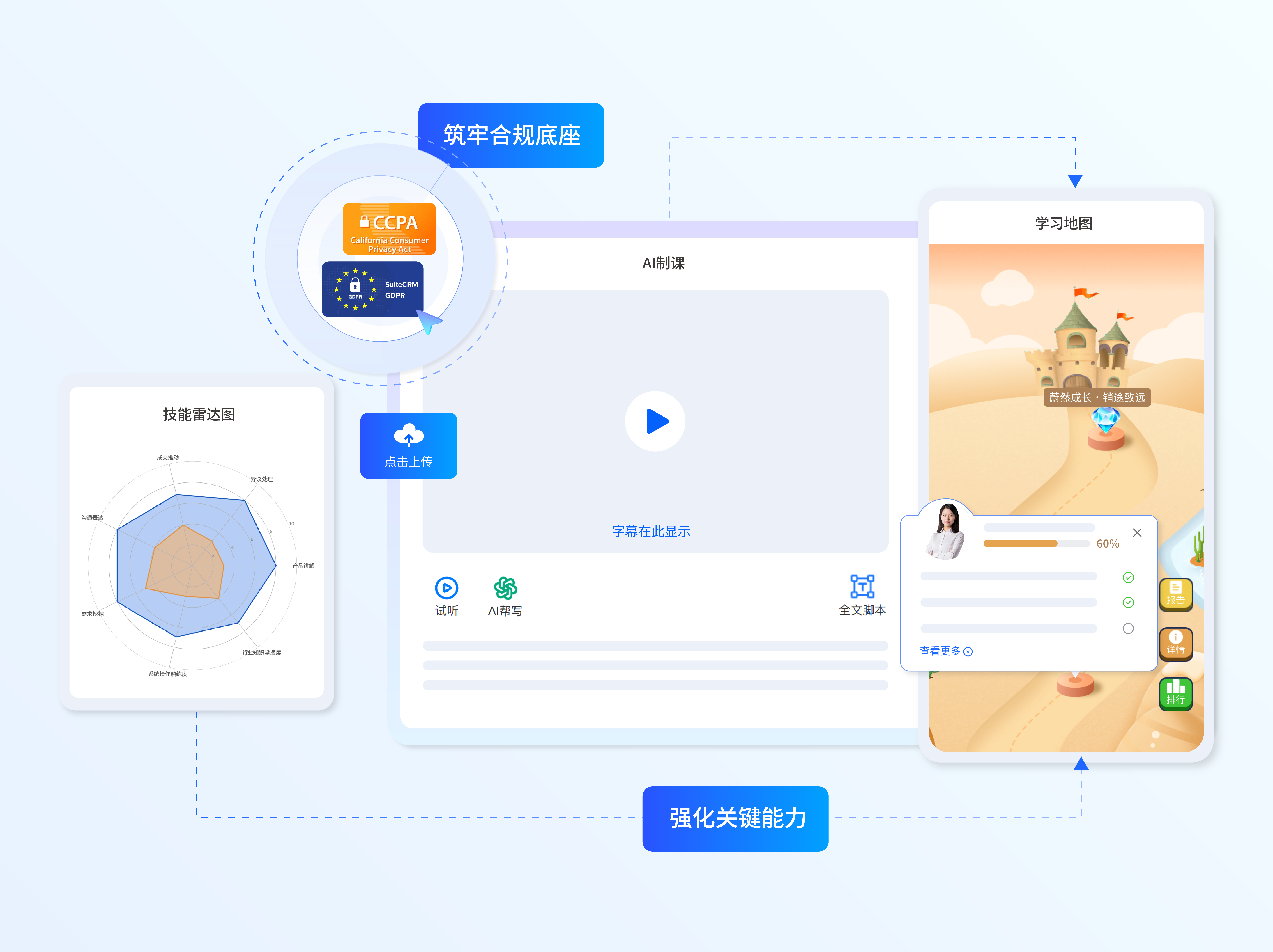(1)在合规方面,符合欧盟GDPR、加州CCPA等各国数据保护法规;存储加密、SSL传输加密、信息脱敏显示等,严格管控跨境数据传输,提供合规日志以备审计。同时,平台支持针对不同国家、不同岗位,自动匹配定制化合规培训课程清单,实现合规培训的精准落地,例如针对欧洲市场的营销人员,重点推送数据隐私合规课程。
