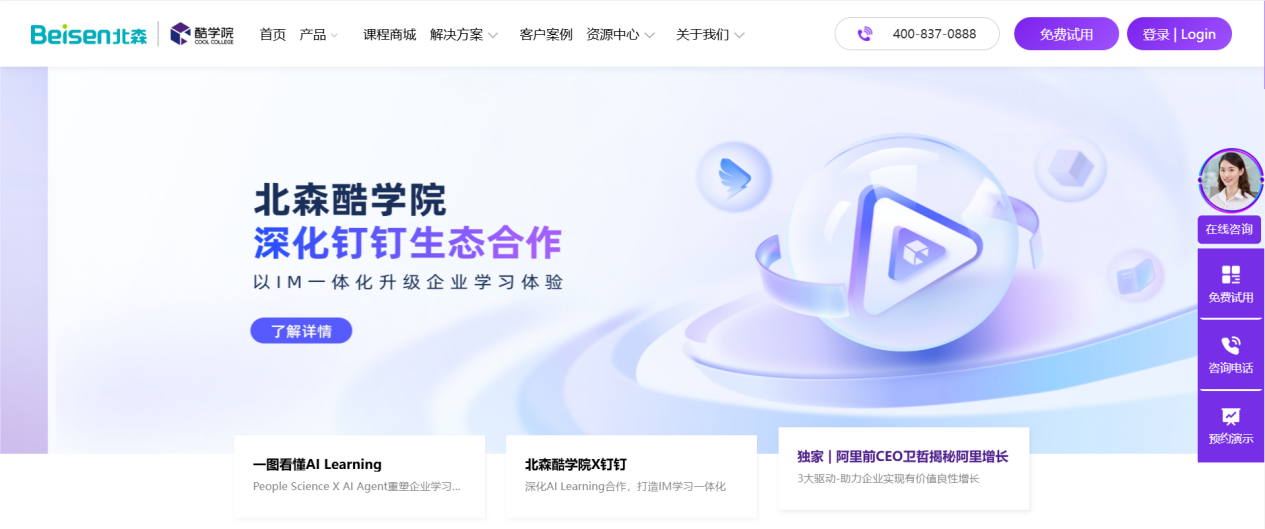 ①AI能力全面:AI能力覆盖培训全流程,采用Transformer深度学习算法,AI问答准确率可达90%以上,AI制课、字幕满足跨国出海企业课件制作、多语转换需求。