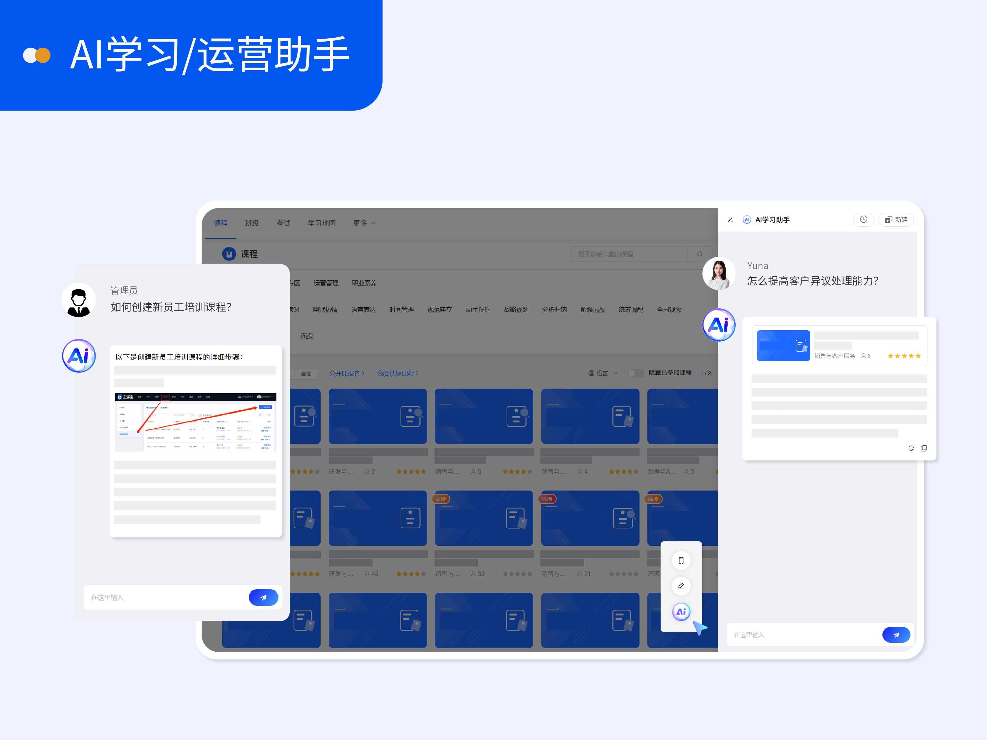 不仅实现学员学习指引,还覆盖管理运营全场景,提供实时、一致的智能支持。如管理员可就课程创建、功能使用等管理操作进行提问,AI会针对疑问提供图文并茂的标准化指引,提升平台使用效率与体验。