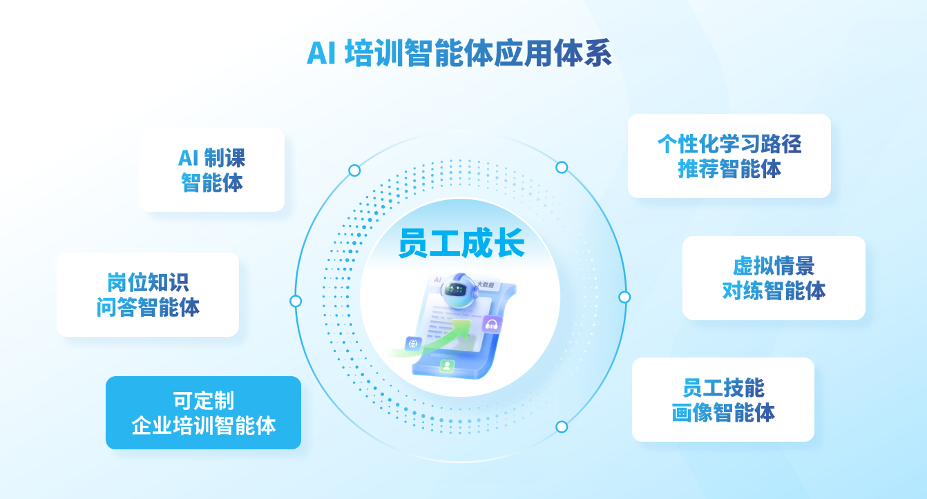 • 智能体调度引擎:支持多AI培训智能体协同调用与工作流编排,让AI制课、智能陪练、技能画像、路径推荐等智能体形成联动,实现培训业务全流程智能化。