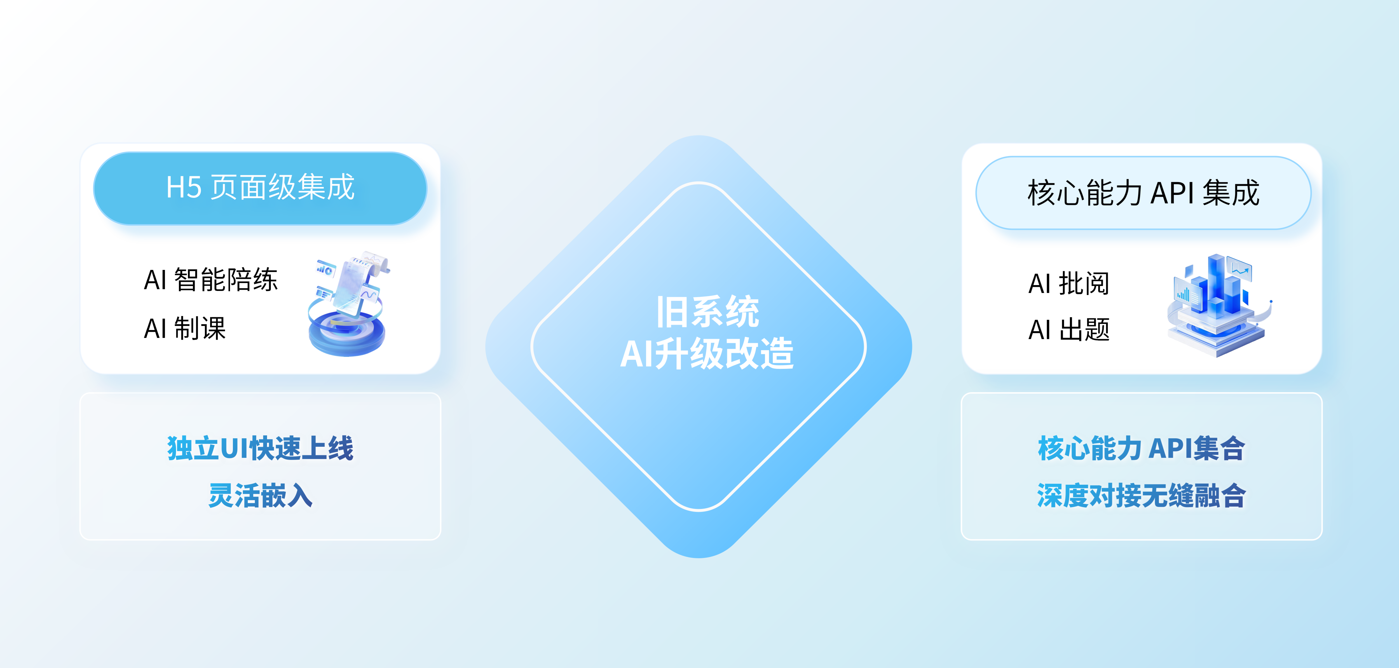 将AI制课、AI出题、AI批阅、个性化推荐等核心能力封装为标准API接口,与企业原有课程管理、考试管理、用户中心等模块深度对接。AI能力不再是外挂模块,而是融入业务流程的“原生功能”——在原有课件制作页面直接调用AI制课,在考试模块无缝启用智能出题。适配性强、业务衔接紧密,适合追求一体化智能培训平台的企业。