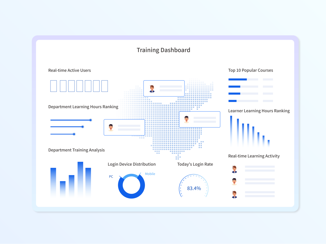 出海企业仅以参训率、完成率为单一评估指标,未形成业务联动的量化评估体系,企业难以准确掌握培训效果。建议搭建柯氏四级本地化评估闭环:反应层做多语言满意度调研,贴合海外员工感知;学习层通过AI监考、多语种考核校验知识掌握;行为层追踪海外岗位实操落地,如合规操作、销售转化;结果层绑定海外核心指标,合规违规率、经销商业绩、海外员工留存率等。于此,依托数据中台的多维度的数据报表,全面复盘评估学习数据、迭代培训内容,从完成培训转向赋能业务,让出海培训效果可追踪、可量化、可优化。