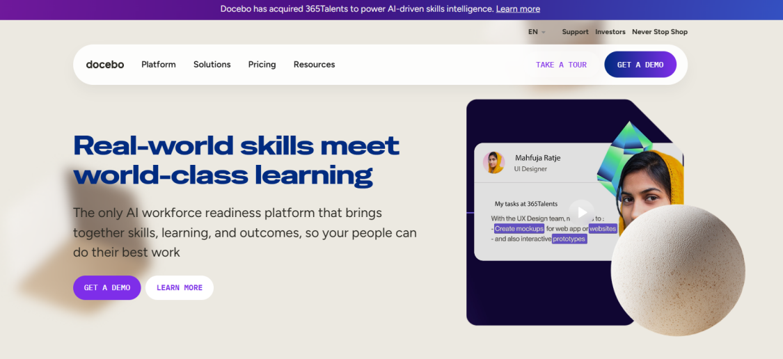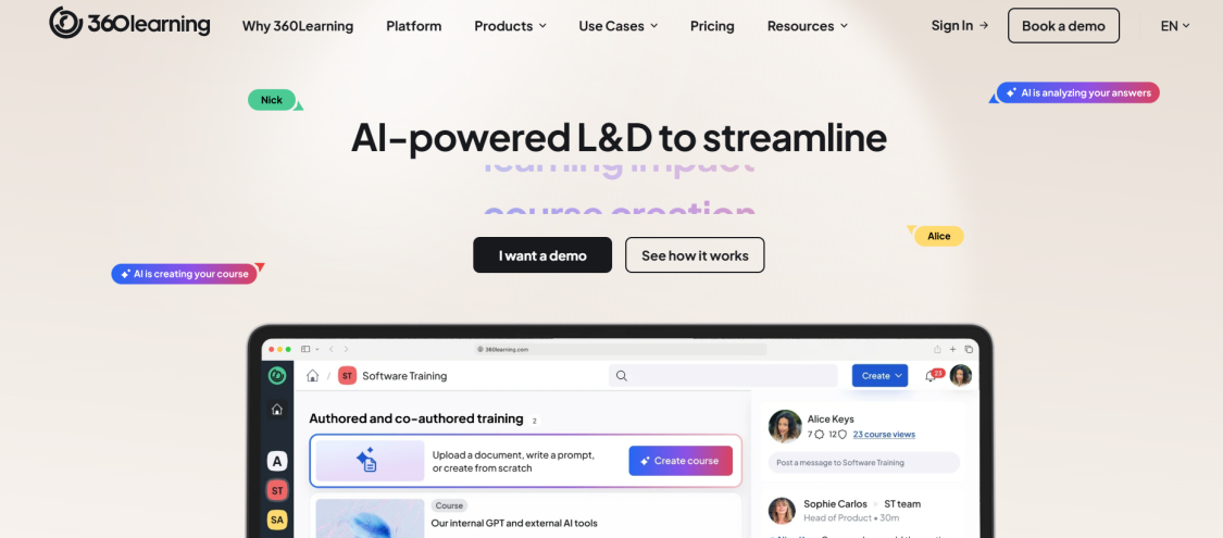 ①AI能力集中在AI文档转课程与社区化学习AI助手;以“AI自动化+人工监督”为设计理念,强调赋能非L&D专业人员轻松创建课程。