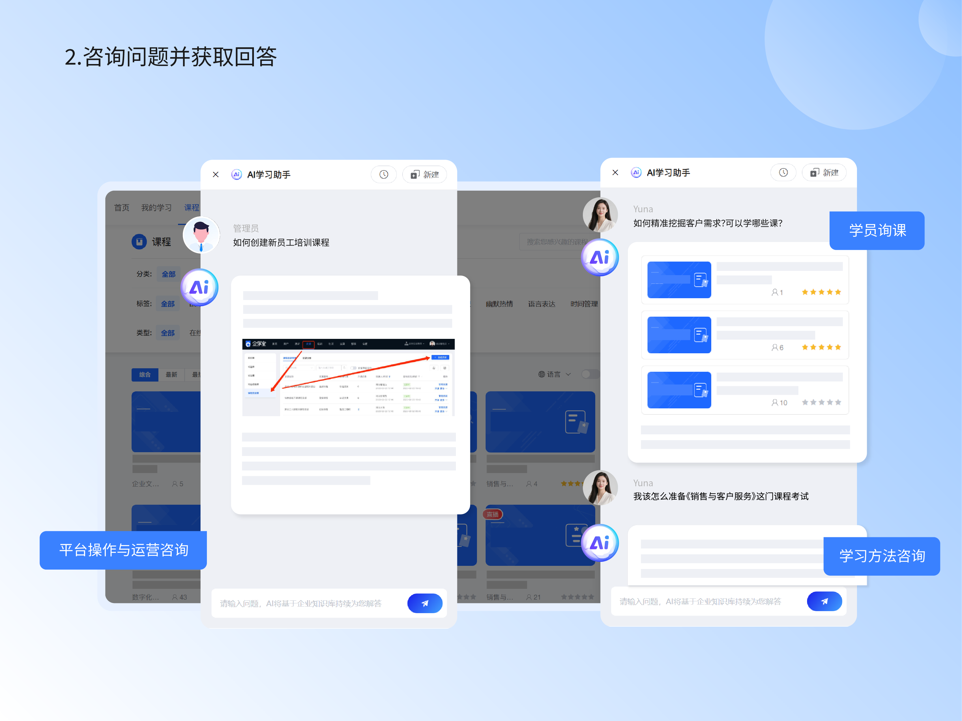 (1)平台操作与管理配置咨询:准确回答创建课程、设置学习地图、配置考试、调整积分规则等提问,并提供图文并茂的操作指引,帮助管理员高效完成各项配置工作。
