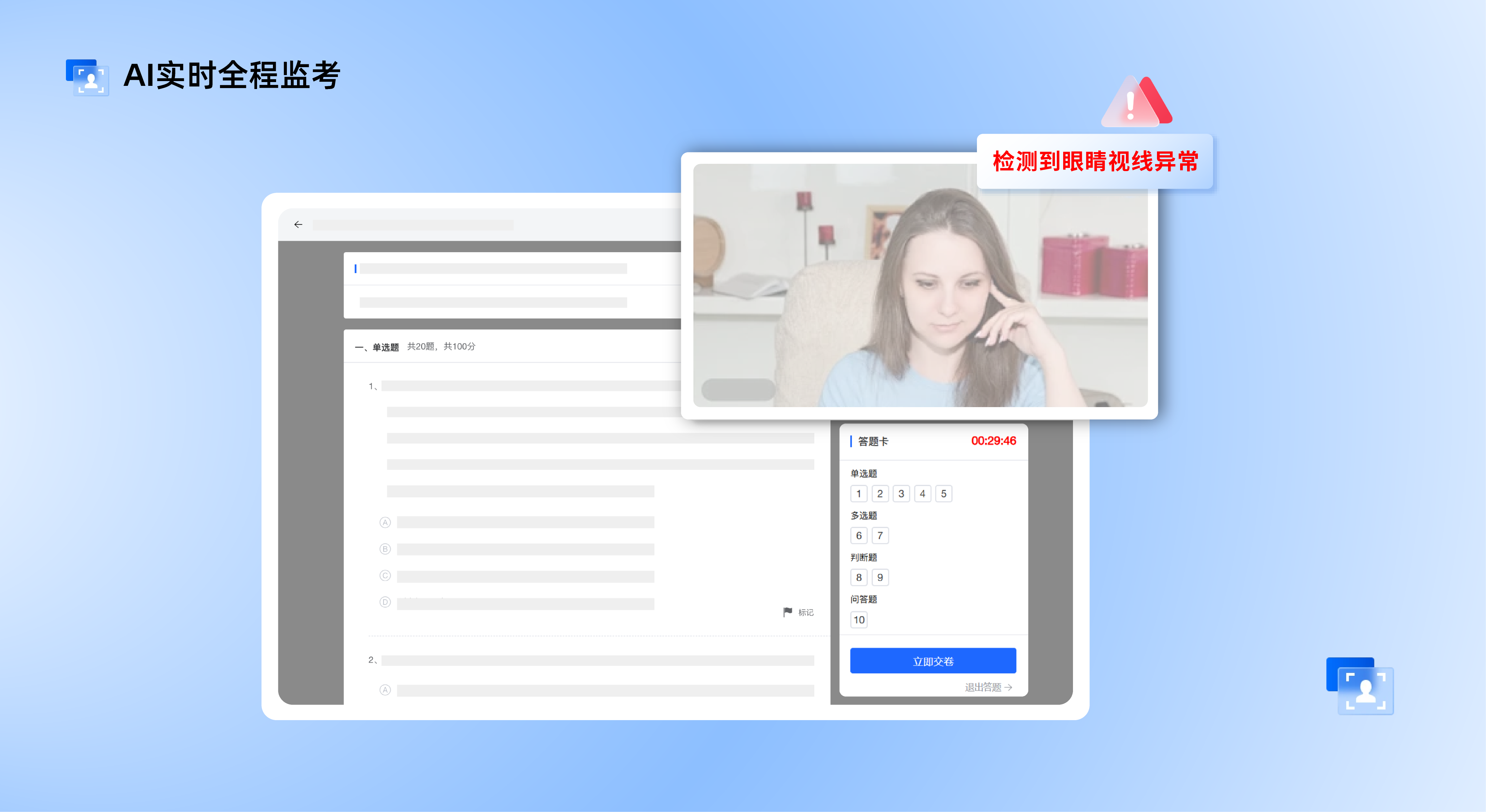 1. 严肃考风考纪:AI全时段智能监控、精准识别作弊行为,有效遏制违规现象,保障考试结果真实可靠。