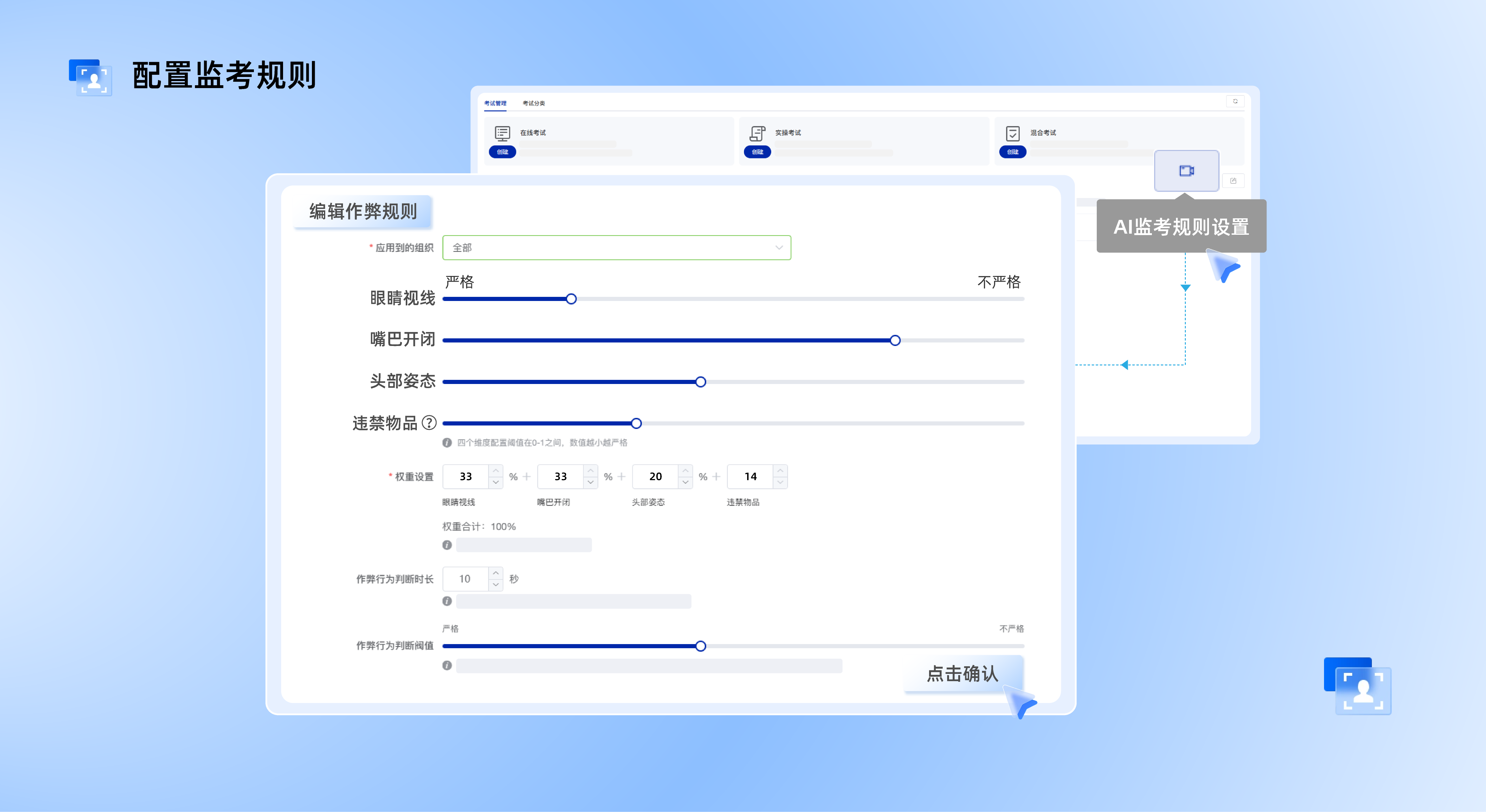 2. 灵活适配场景:多维度阈值与权重可精细调节,从认证考试到常规测验,均可按需配置严格程度,兼顾严肃性与用户体验。