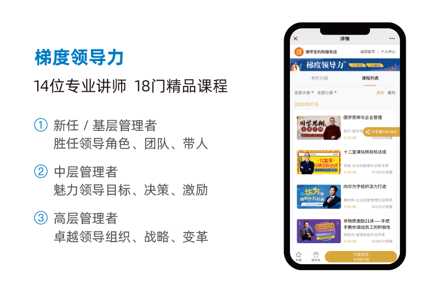 梯度领导力课程则分为新任/基层管理者、中层管理者和高会管理者三个层级,共有14位专业讲师和18门精品课程,旨在帮助企业领导者提升领导力和营理能力。